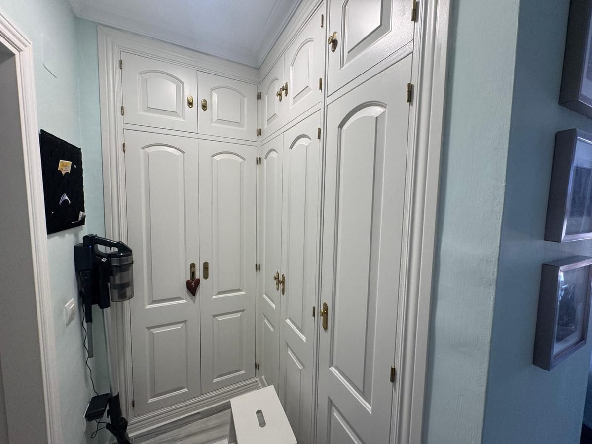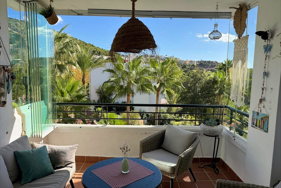 To your left, a recently refurbished, fully equipped kitchen features modern fittings and a new water boiler. From here, step out onto a charming covered terrace — a peaceful spot for morning coffee under the soft sun, with uninterrupted views of mature greenery and the fairways of Alhaurín Golf. Sheltered from the intense afternoon heat, it’s also an inviting retreat for summer relaxation.