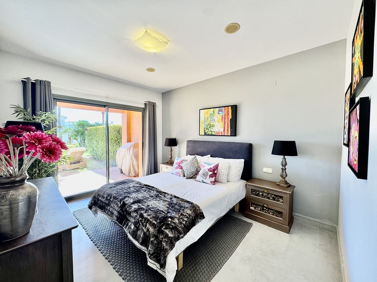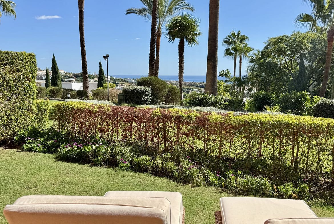 This beautiful ground-floor apartment boasts fabulous views of the sea and golf courses. Located in the exclusive Royal Flamingos community, next to the 5-star Villa Padierna Hotel, it features a master bedroom with an en-suite bathroom, a second bedroom with a separate bathroom, and a fully equipped kitchen with a utility room.