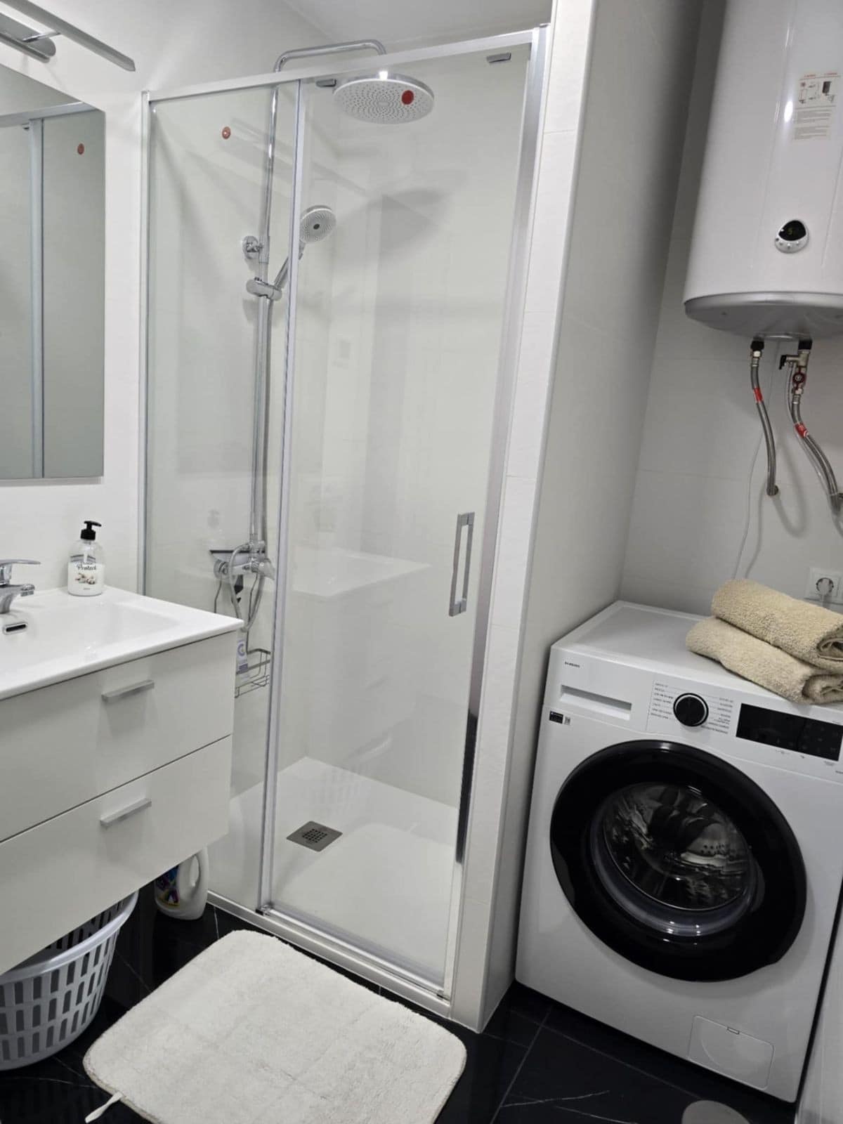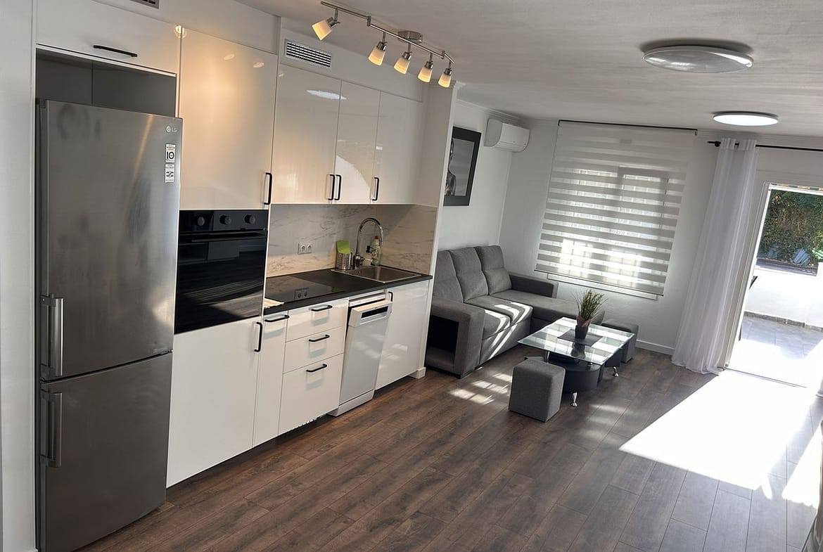 This apartment is located in Manilva, in a quiet and peaceful urbanization surrounded by villas and lush greenery. The area offers a lot of privacy, and the swimming pool boasts stunning sea views. The apartment has been completely renovated — everything is brand new, including underfloor heating and a modern air-conditioning system. It also features a charming private courtyard.