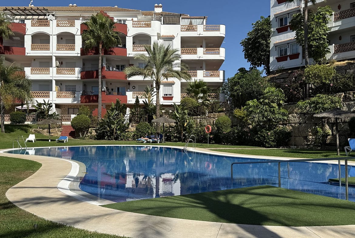 One of the best complexes in Riviera del Sol. Island of Riviera, with its beautifully landscaped and maintained gardens full of subtropical plants, trees and lawns, 2 beautiful outdoor pool areas, an indoor heated pool, tennis and padel tennis courts and an onsite bar/restaurant! This third floor apartment, accessed via lift or stairs, is bright and spacious. It comprises of entry hall, lounge/dining room, fully fitted modern kitchen, 2 double bedrooms and 2 bathrooms. The south west facing balcony stretches the full width of the apartment and offers fabulous garden, pool and sea views. The glass sided lift offers stunning golf and mountain views too! Included in the price is a private underground parking space also. Ample guest parking available too. The apartment has a holiday rental licence .