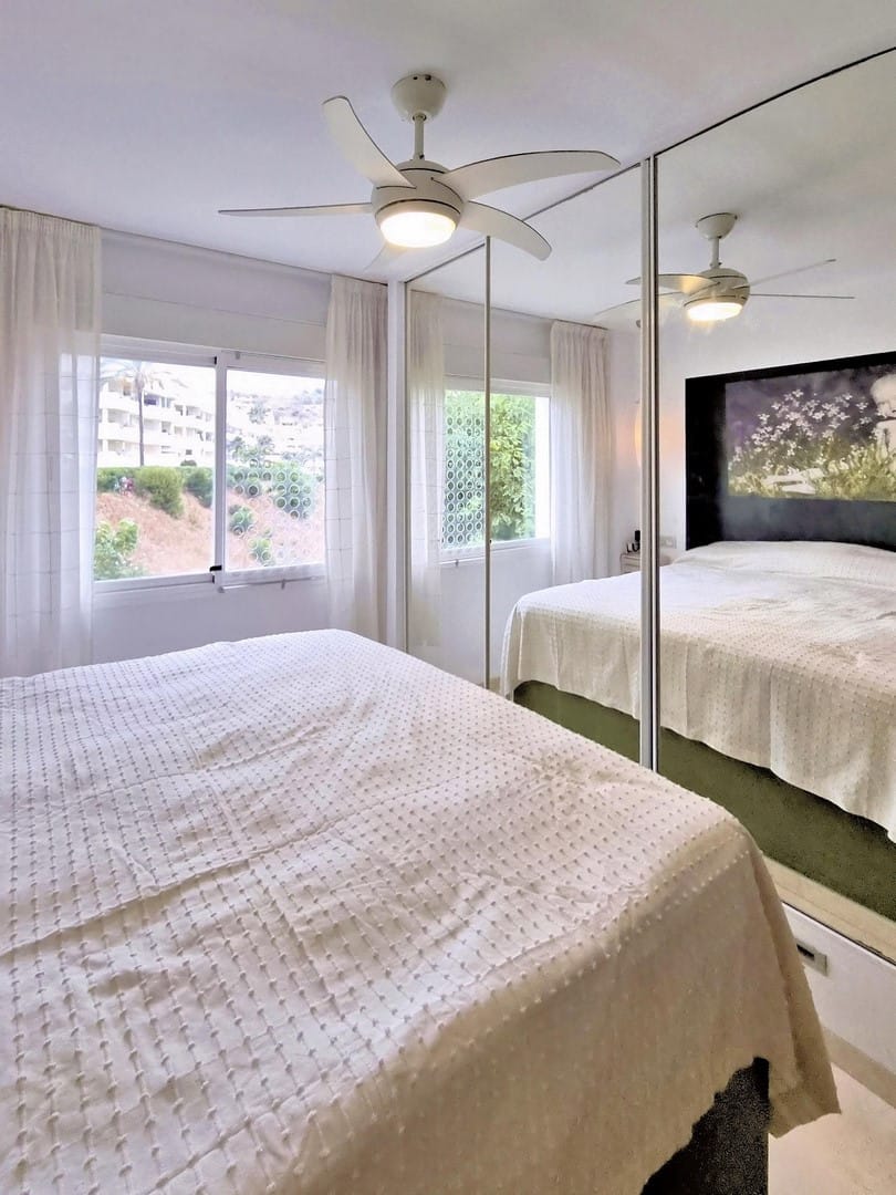 Spacious and bright south-facing corner apartment in Calahonda, combining spaciousness, comfort, and spectacular sea and mountain views. Originally with three bedrooms, it has been converted into two, integrating one bedroom into the living room to create a larger and more versatile space. It has two bathrooms, a dressing room, a laundry room, and a partially furnished kitchen. The property has a covered terrace, ideal for enjoying the weather and sea views, and also has an underground garage and storage room. Its corner location guarantees greater privacy and natural light. Features include hot/cold air conditioning, marble floors, double glazing, built-in wardrobes, and wheelchair access. The development offers two communal swimming pools, well-maintained gardens, an intercom, a gated community, and excellent maintenance. Located on a quiet one-way street, it is within walking distance of restaurants and a 5-minute drive from buses, supermarkets, golf courses, tennis courts, and the beach. A unique opportunity to live in one of the most sought-after areas of the Costa del Sol, perfect as a permanent residence or investment.