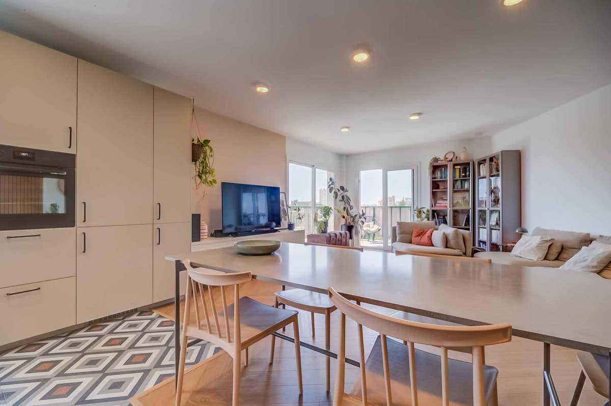 The property offers three double bedrooms, two modern bathrooms and a living-dining room with an integrated kitchen that opens up to natural light. The third bedroom, which is glazed and connected to the living area, is ideal as an office or guest room, adding versatility to the space. It also has a practical laundry room hidden behind wooden slats, maintaining the order and aesthetics of the flat. Every detail of the flat has been designed to offer comfort and contemporary style, with elegant finishes and a functional layout.