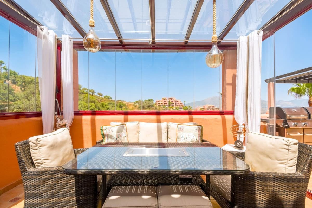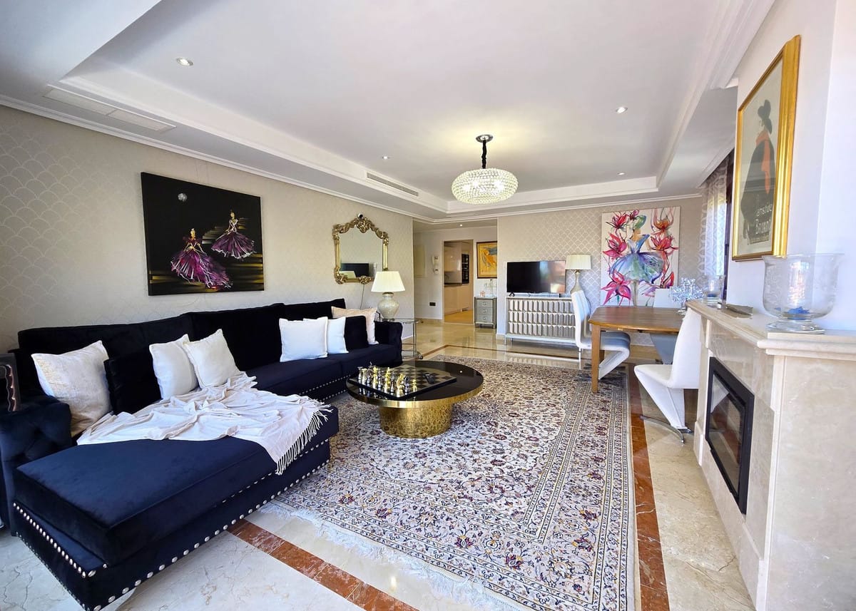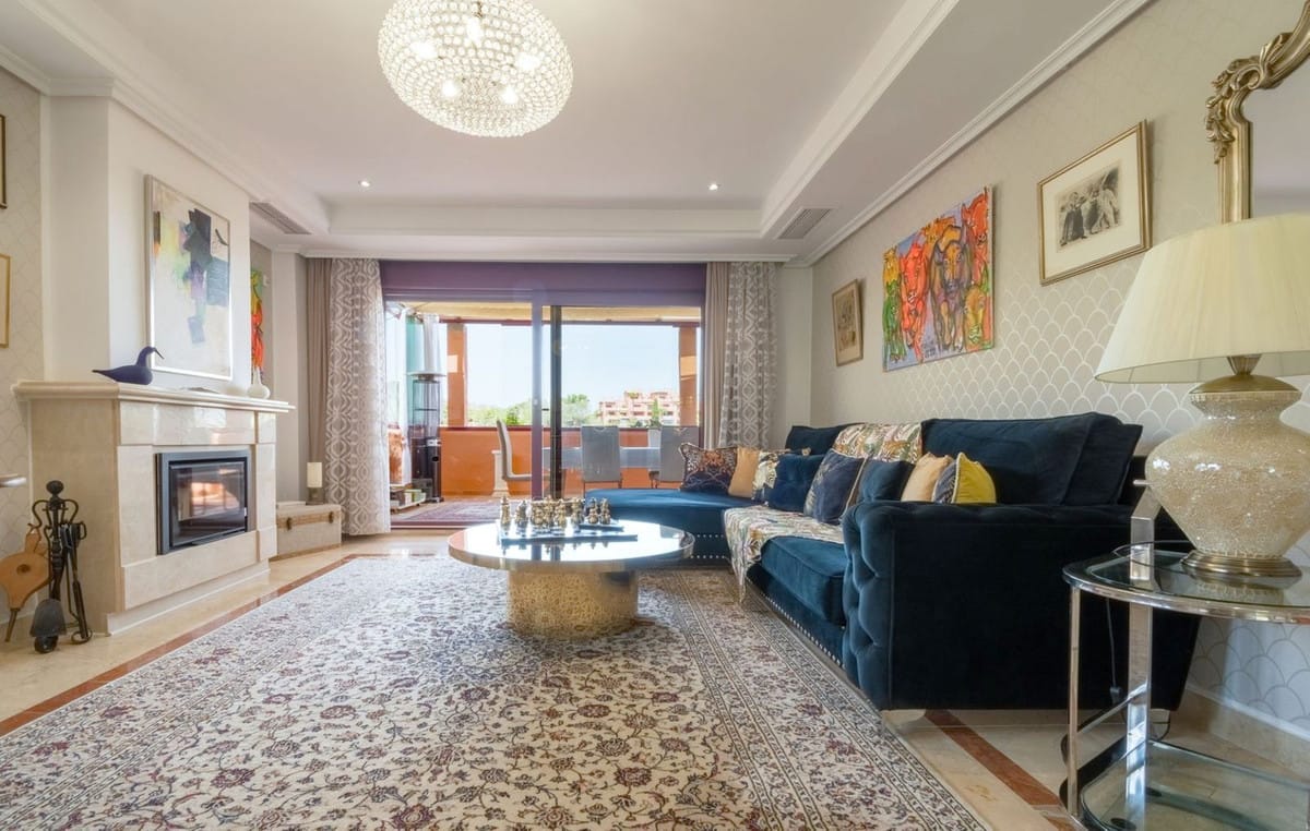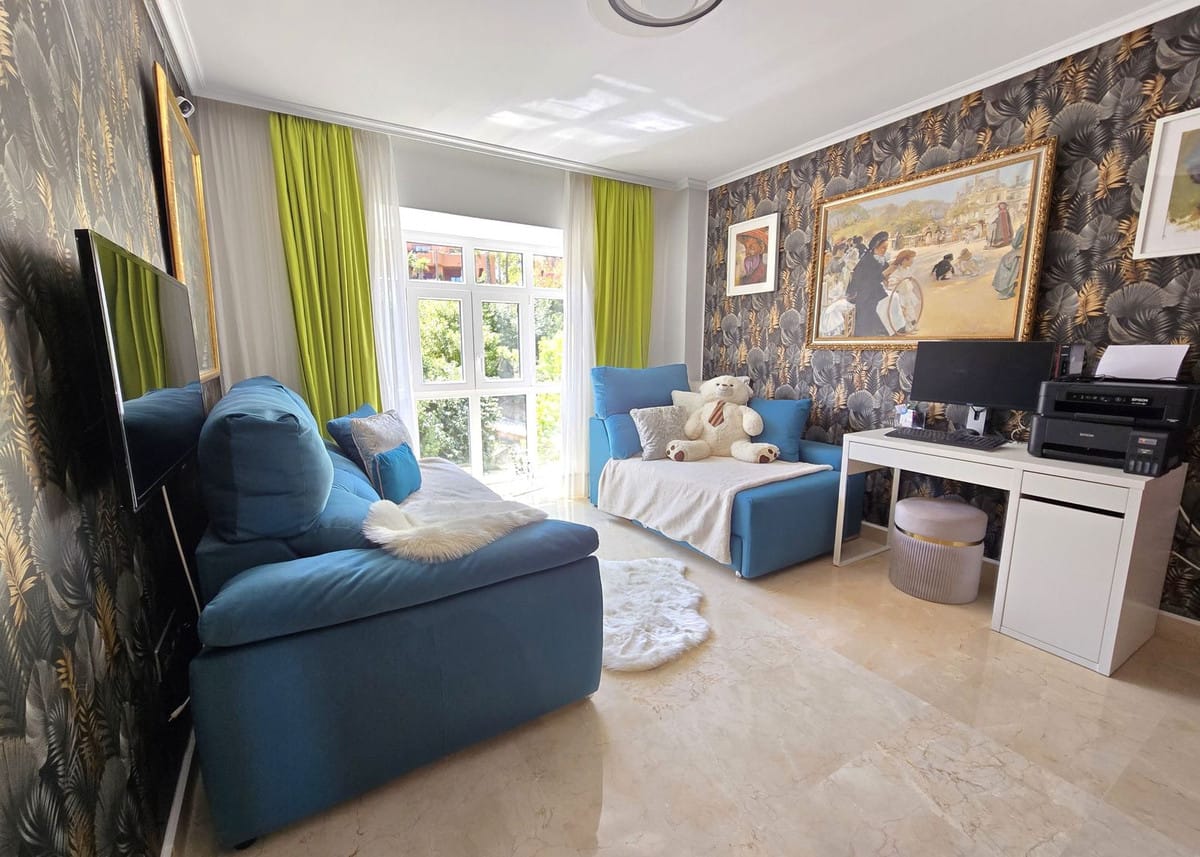 The welcoming living room, complete with a cozy fireplace. Opens onto a spacious glazed terrace that showcases spectacular views of the golf course and the rolling Mijas mountains. The brand-new, fully equipped modern kitchen includes a convenient utility room, blending sleek design with everyday functionality.