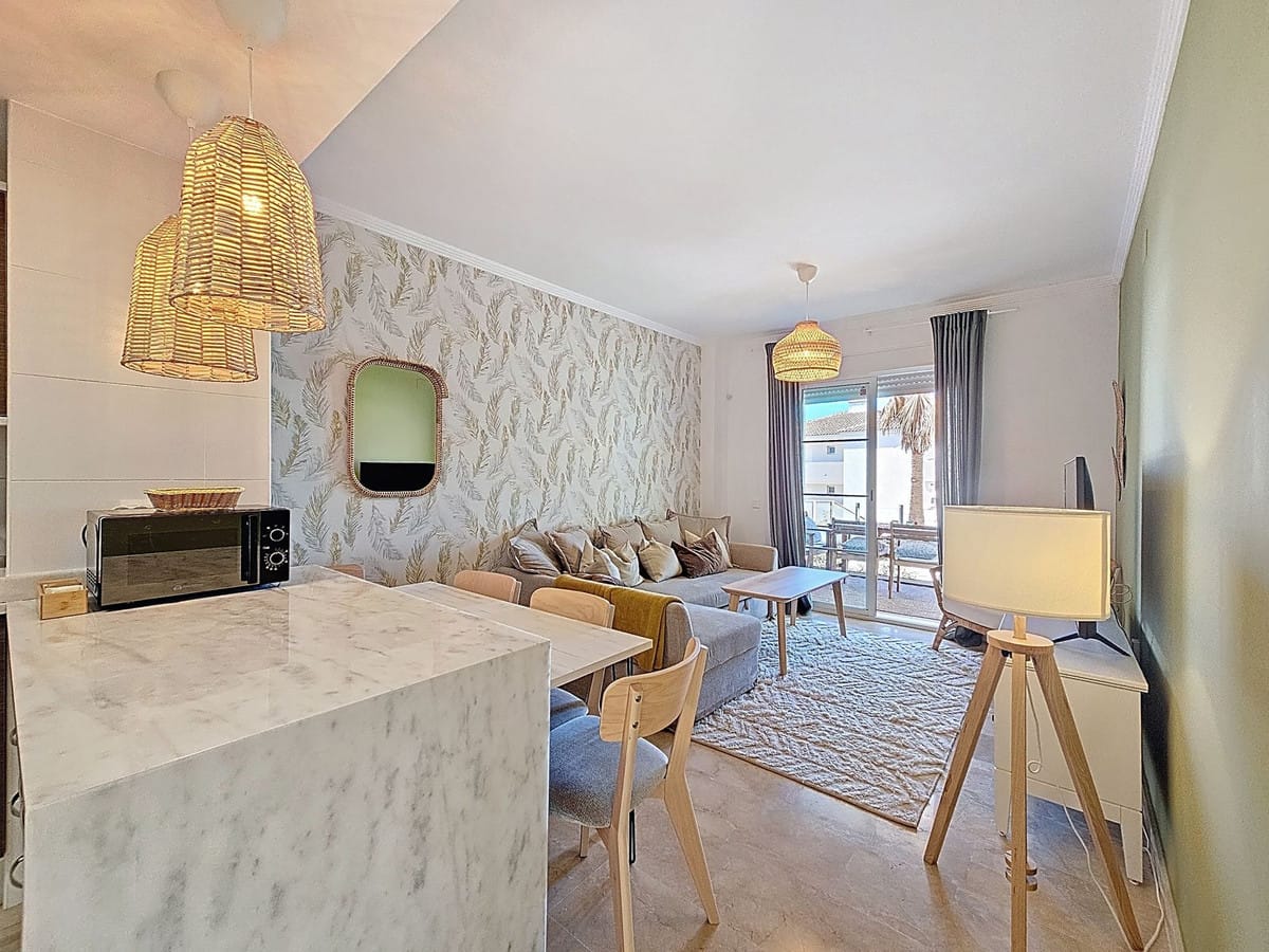 Discover this charming three-bedroom ground-floor apartment located in the peaceful residential complex Small Oasis, just a few minutes from the beach and Puerto de la Duquesa. The property offers approximately 87 m² built and features a welcoming entrance hall, a bright open-plan living and dining area with direct access to the terrace, a fully equipped kitchen, three bedrooms, a complete bathroom, and a guest toilet. It enjoys two private terraces, ideal for outdoor dining or simply relaxing in the sun, with direct access to the beautiful communal gardens of the urbanization. The complex offers a quiet and green environment with easy parking and excellent connections: only five minutes by car from Puerto de la Duquesa, ten minutes from Sotogrande Marina, fifteen minutes from Estepona’s old town, and about a twenty-five-minute walk to the beach. A new pool area with gym and on-site restaurant is currently being built, adding even more comfort and lifestyle options to the existing communal pool and landscaped gardens. This property makes an ideal holiday home, investment opportunity, or permanent residence on the Costa del Sol.