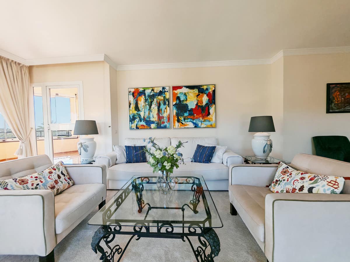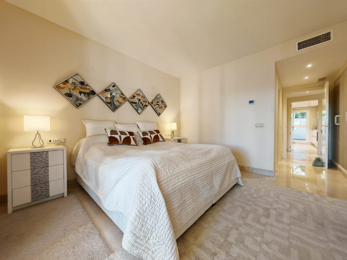 Apartment for sale in Las Terrazas de Santa Maria Golf, Marbella with 3 bedrooms, 2 bathrooms and with orientation south/east, with communal swimming pool and private garage (1 parking spaces). Regarding property dimensions, it has 142 m² built and 45 m² terrace. Has the following facilities amenities near, transport near, air conditioning, fully fitted kitchen, utility room, marble floors, storage room, security entrance, double glazing, video entrance, dining room, private terrace, kitchen equipped, living room, country view, golf view, laundry room, internet – wi-fi, covered terrace, fitted wardrobes, gated community, lift, pool view, panoramic view, close to golf, balcony, optional furniture, excellent condition, recently renovated / refurbished, close to shops, close to schools, surveillance cameras and office room.