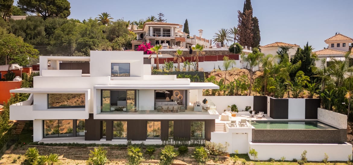 Set on a south-facing plot of over 1,000 m², this newly built villa delivers sweeping views of the Mediterranean Sea and surrounding mountains. Developed by Sands Villas and designed by Gonzalez Jacobson, the property combines sharp modern architecture with natural textures and floor-to-ceiling glass for seamless indoor-outdoor living.